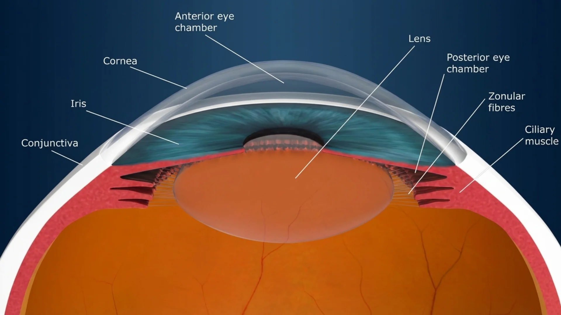 Located in the anterior segment of the eye, the lens divides the eye into two chambers: the anterior chamber between the cornea and lens filled with aqueous humor, and the posterior chamber behind the lens filled with vitreous humor. This strategic position allows it to receive light that has already been partially focused by the cornea and refine that focus before the light reaches the retina.