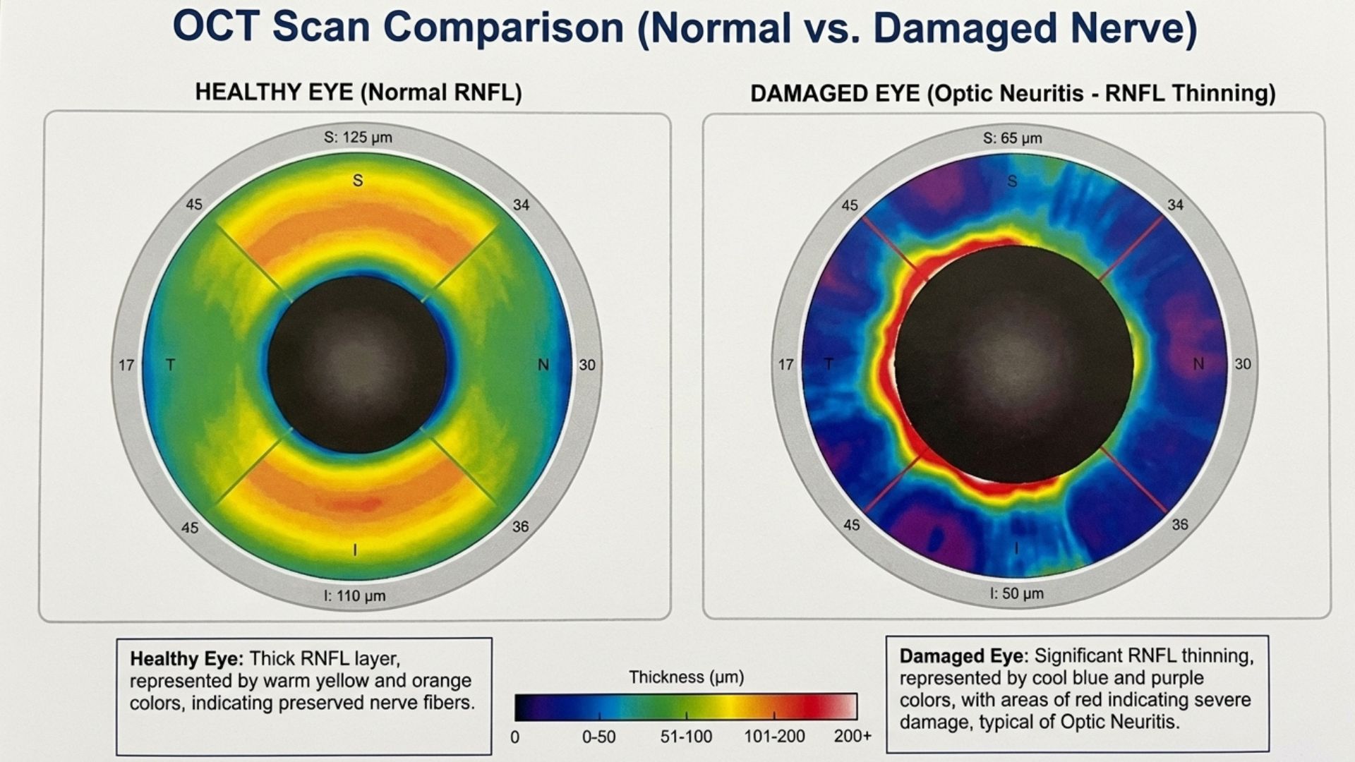 In conditions like optic neuritis, the OCT can detect thinning of the RNFL and the Ganglion Cell Layer, which correlates with permanent nerve damage. It helps distinguish true papilledema from Optic Disc Drusen.