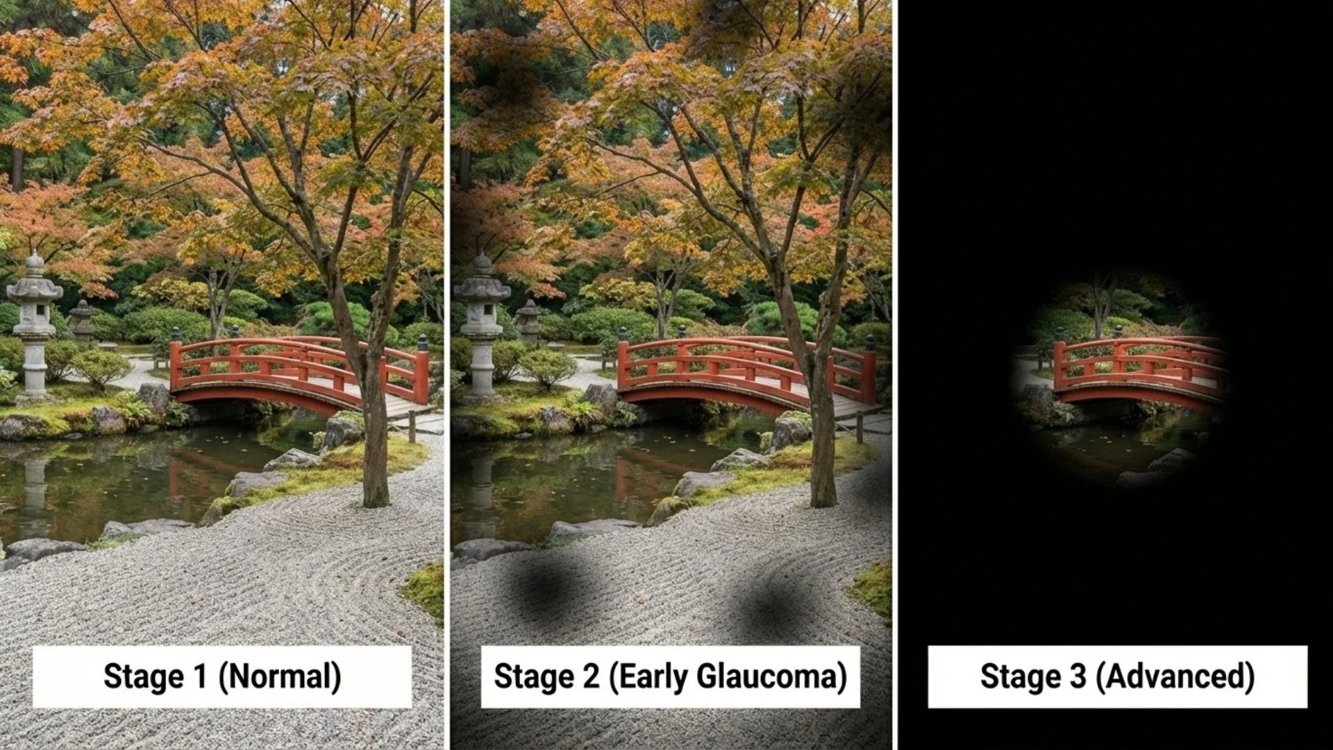 Acute Angle-Closure: A medical emergency where the pressure spikes suddenly. Symptoms include severe eye pain, nausea, vomiting, halos around lights, and blurred vision. Immediate treatment is required to prevent permanent blindness within hours.
