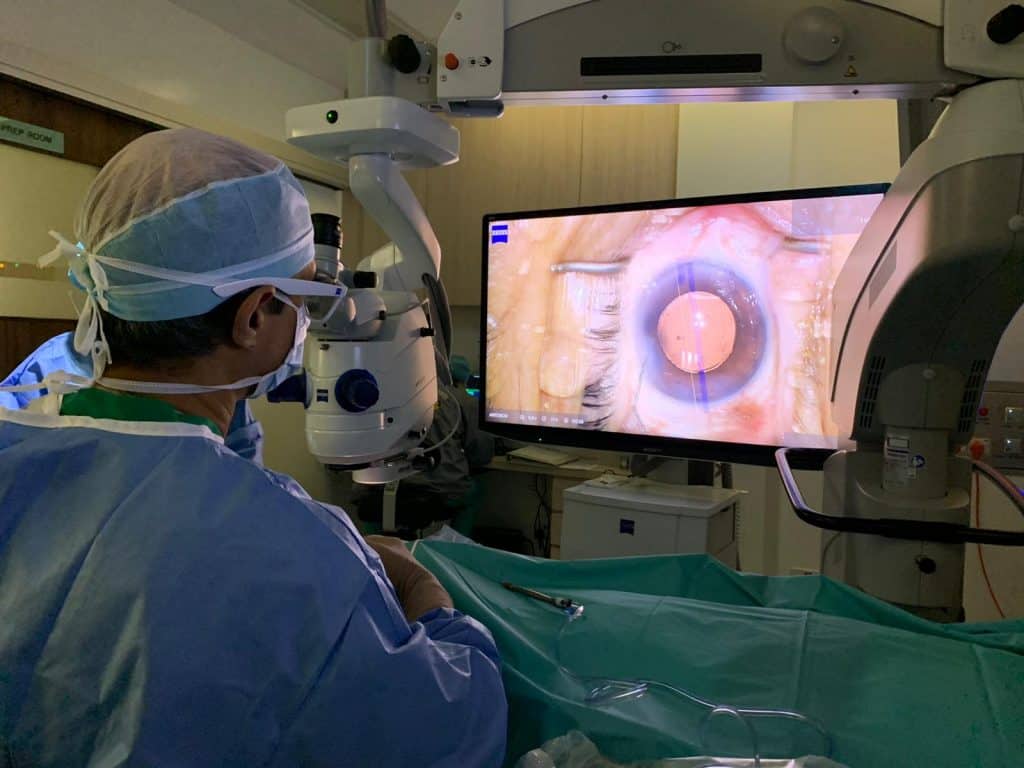 The surgeon sits in a comfortable ‘heads up’ position and looks at the screen through special ‘3D glasses’ during the entire surgery. This is unlike conventional operating microscopes where the surgeon looks through the eye piece of the microscope downwards while the patient lies on the operating table.