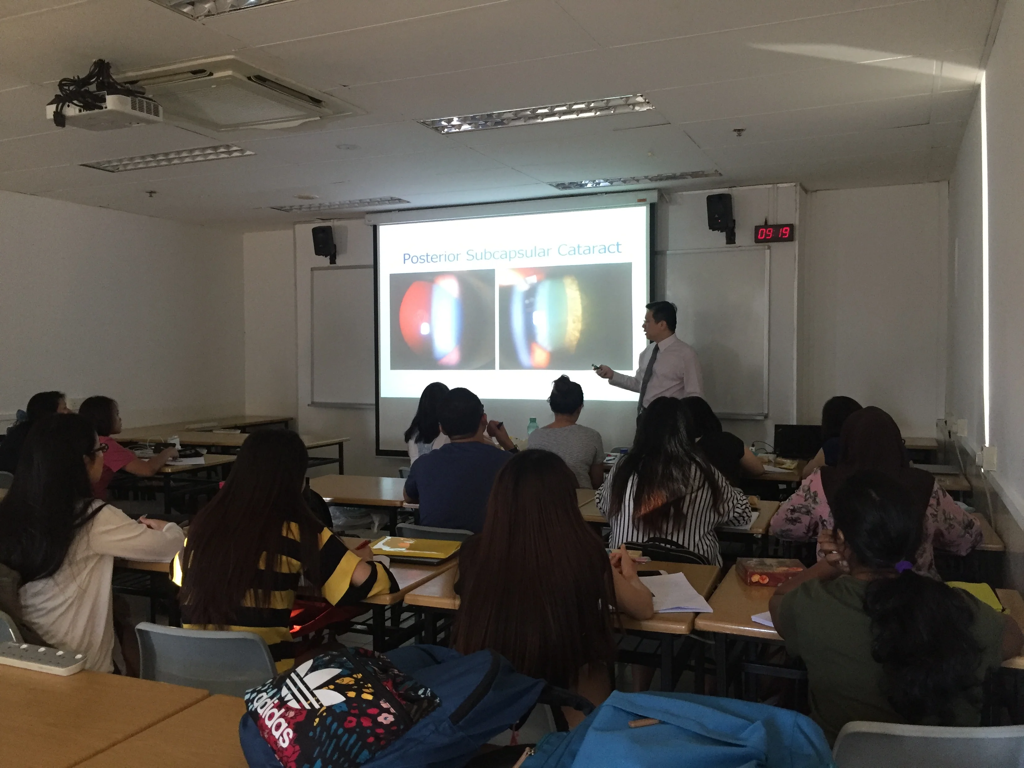 Dr Au Eong’s lecture went into details about cataract and its surgery, including the symptoms, signs and types of cataract, surgical considerations, pre- and post-operative eyedrops, anaesthesia requirement, cataract surgery equipment, types of intraocular lens and surgical complications.