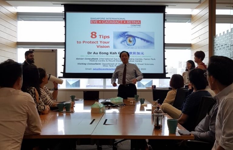 Dr Au Eong Kah Guan, Medical Director and Senior Consultant Ophthalmologist from International Eye Cataract Retina Centre, marked World Sight Day 2017 by sharing 8 tips on how to protect and preserve one’s vision with staff from Novartis (Singapore) Pte Ltd on 12 October 2017. The educational session was conducted in Mapletree Business City. Novartis is a global healthcare company head-quartered in Switzerland that provides solutions to a wide range of medical needs of patients worldwide.