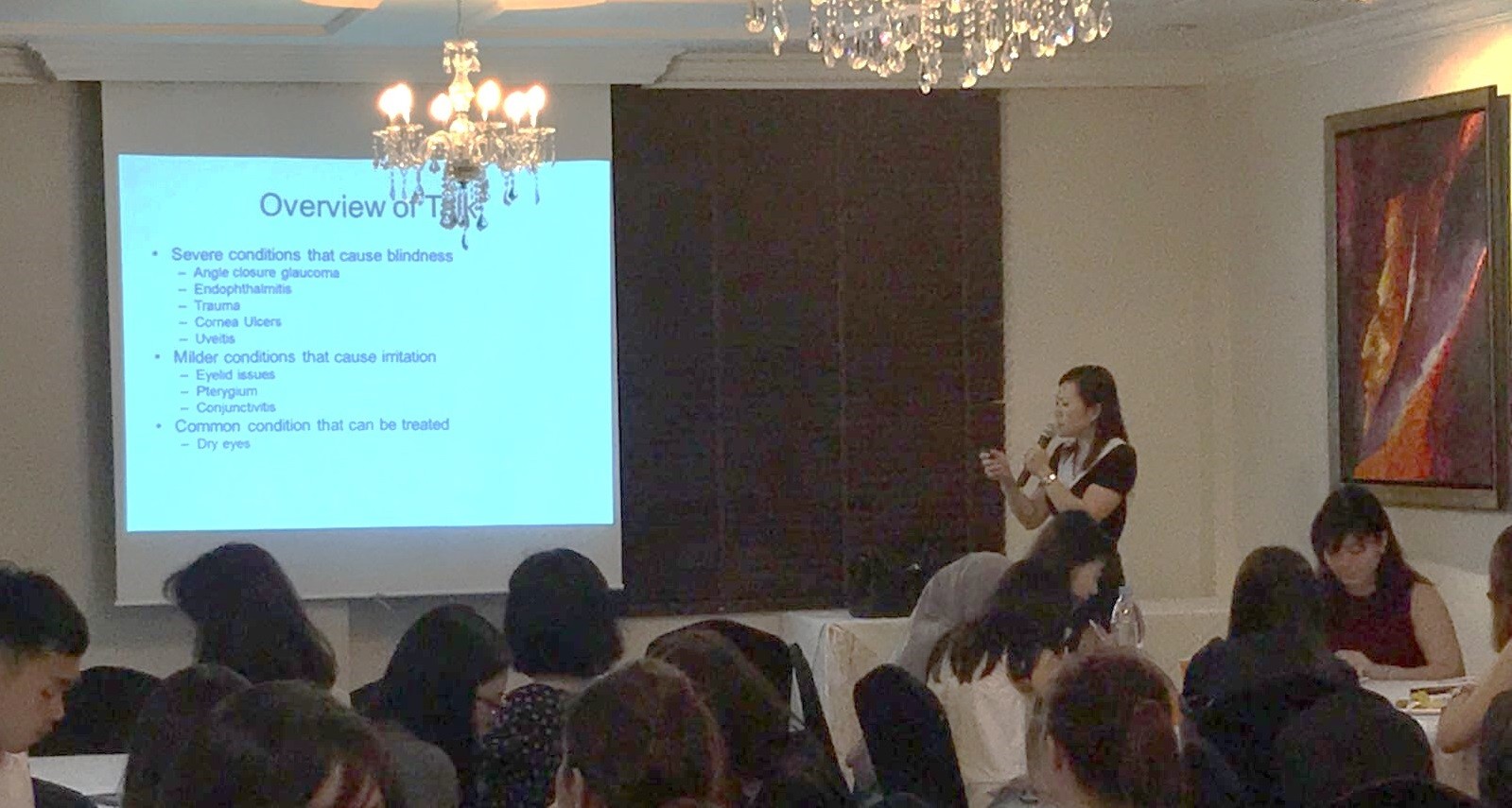 Dr Chan kicked off the talk by discussing the common causes and highlighted important signs and symptoms associated with red eye where an urgent referral to an ophthalmologist is required, such as acute angle closure glaucoma and corneal ulcer. She gave a detailed description of each condition and emphasized the key management principles for each of them.
