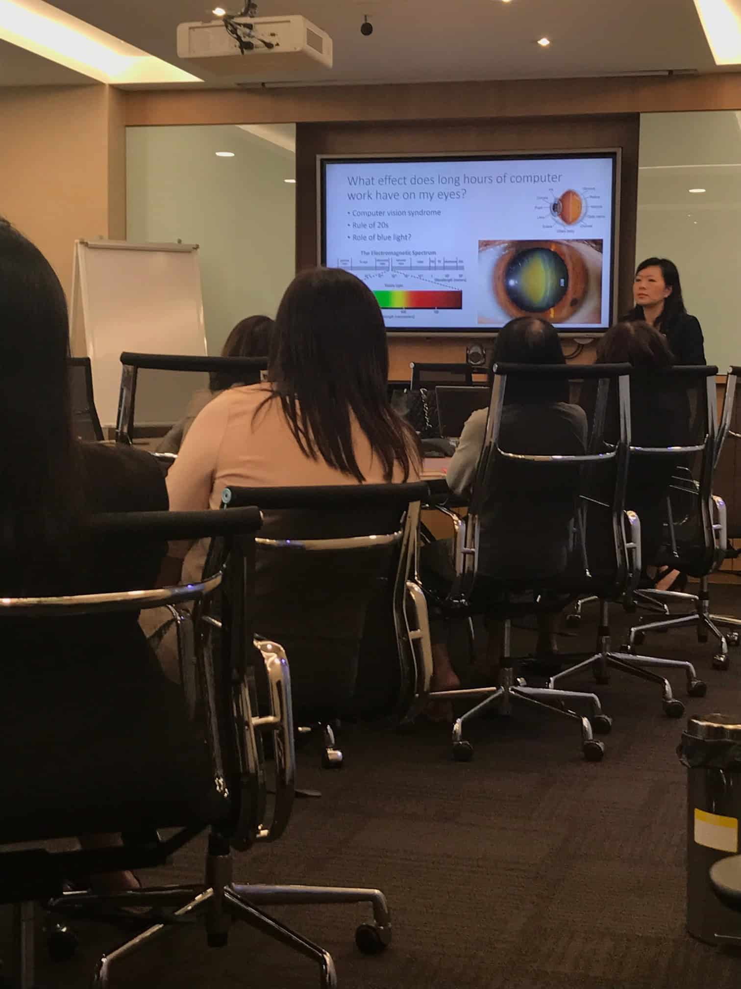 Computer vision syndrome, also known as digital eye strain, refers to a category of visual symptoms resulting from the prolonged use of digital devices. Some of these symptoms include eye strain, blurry vision, dry eye as well as neck and shoulder ache. Dr Chan shared the “Rule of 20s”. For every 20 minutes of near work, one is advised to focus on an object at 20 feet (6 metres) for 20 seconds to give their eyes a break and reduce eye strain. Dr Chan also gave practical tips applicable for the staff like positioning their computer monitor at a viewing distance of 40 cm slightly below eye level.
