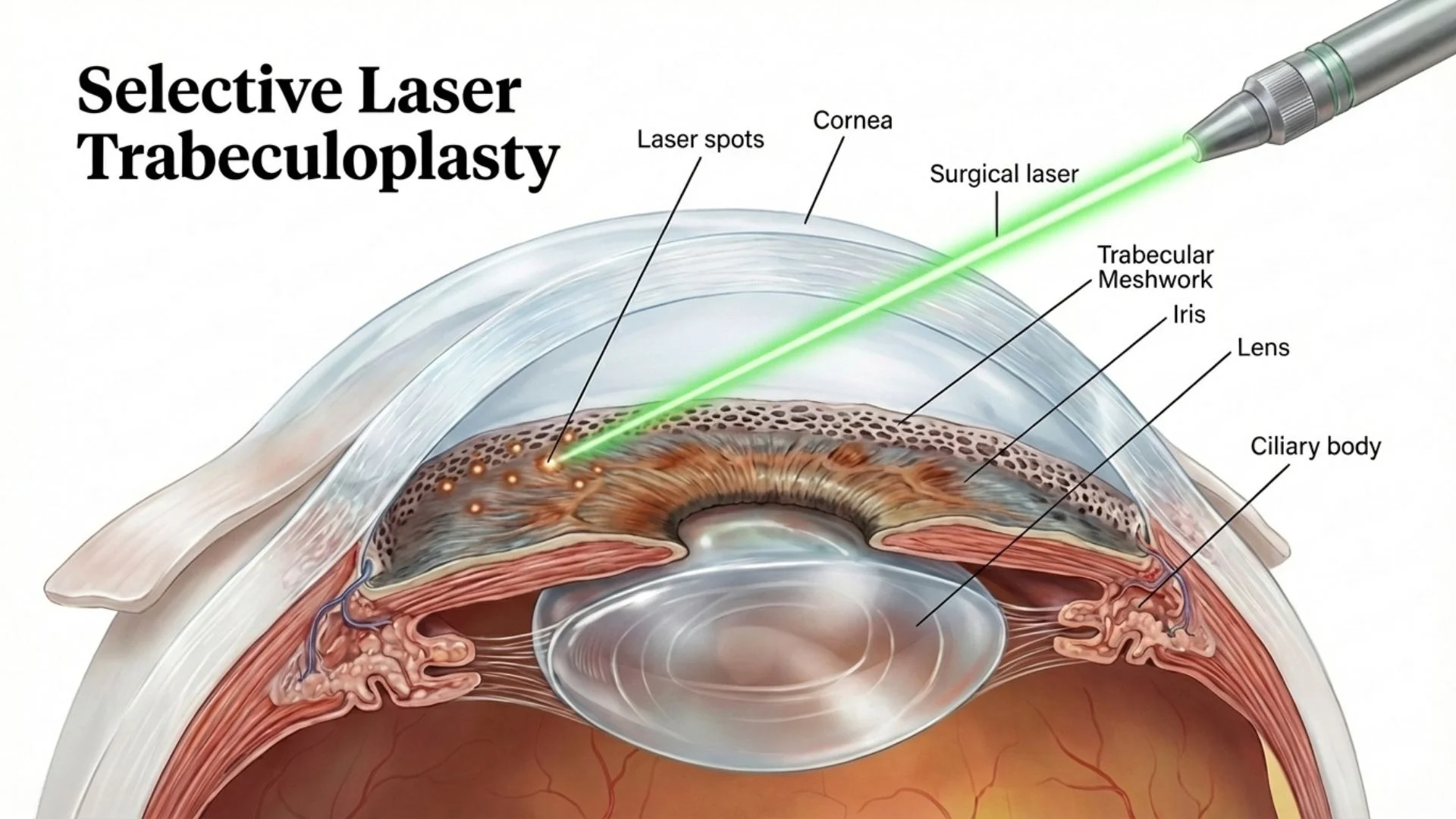 SLT uses short pulses of low-energy laser light to stimulate the trabecular meshwork cells without causing thermal damage. This triggers a biological response that improves drainage over the following weeks.
