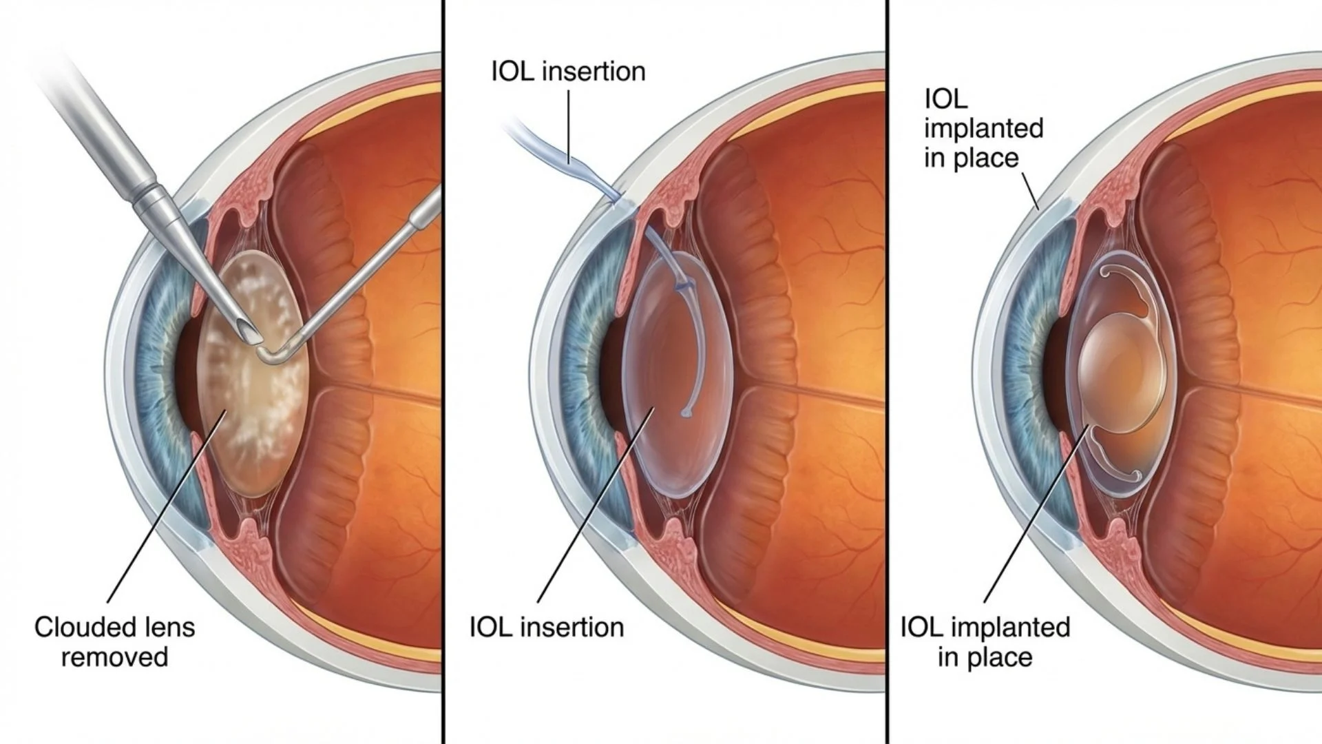 The procedure typically uses small incisions at the edge of the cornea, through which the surgeon removes the clouded lens using a process called phacoemulsification. An artificial lens is then implanted to restore clear vision. Patients usually experience improvement within a few days of surgery, though complete healing may take several weeks.